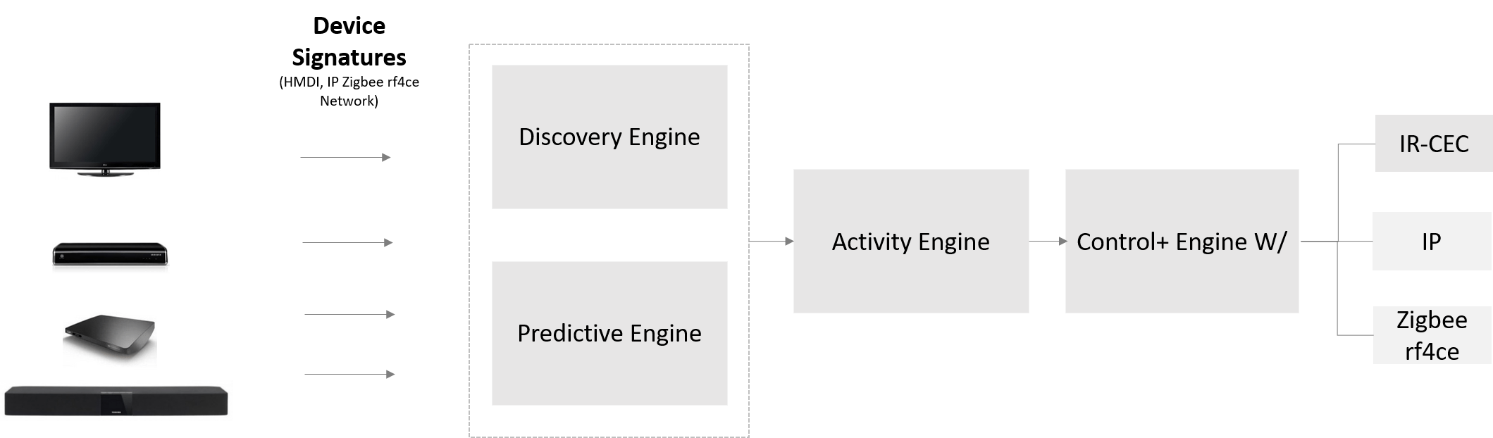 Control+ Engine W/ IR-CEC configures the control point such as the remote control. It constructs and maintains the activities that were identified by the Activity Engine. The following flowchart explains the series of events in this engine.