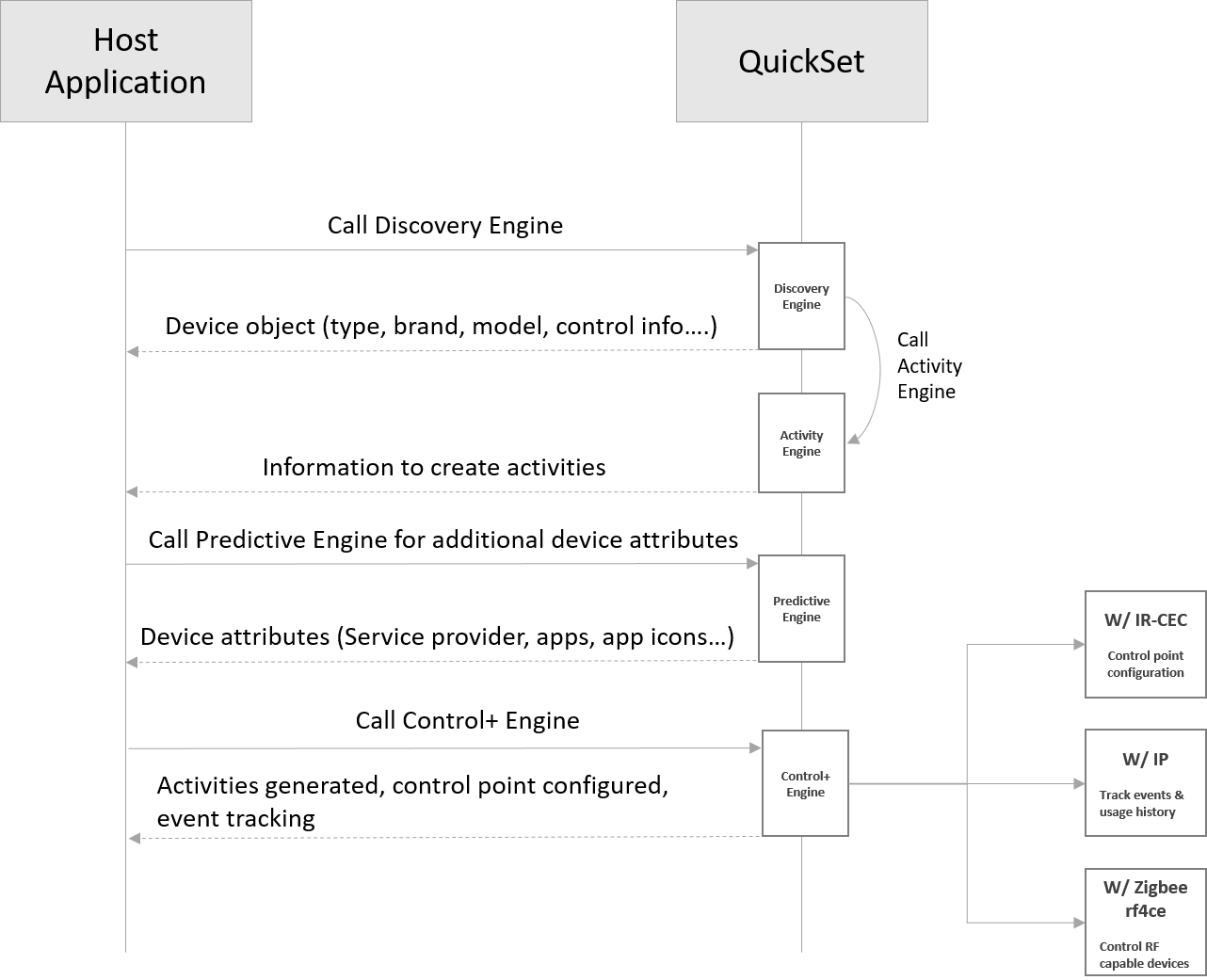 QuickSet is designed to make this experience a hassle-free journey by its automatic recognition of devices within the home and control point configuration. Following sequence diagram covers the flow of events between the host application and QuickSet Engines.